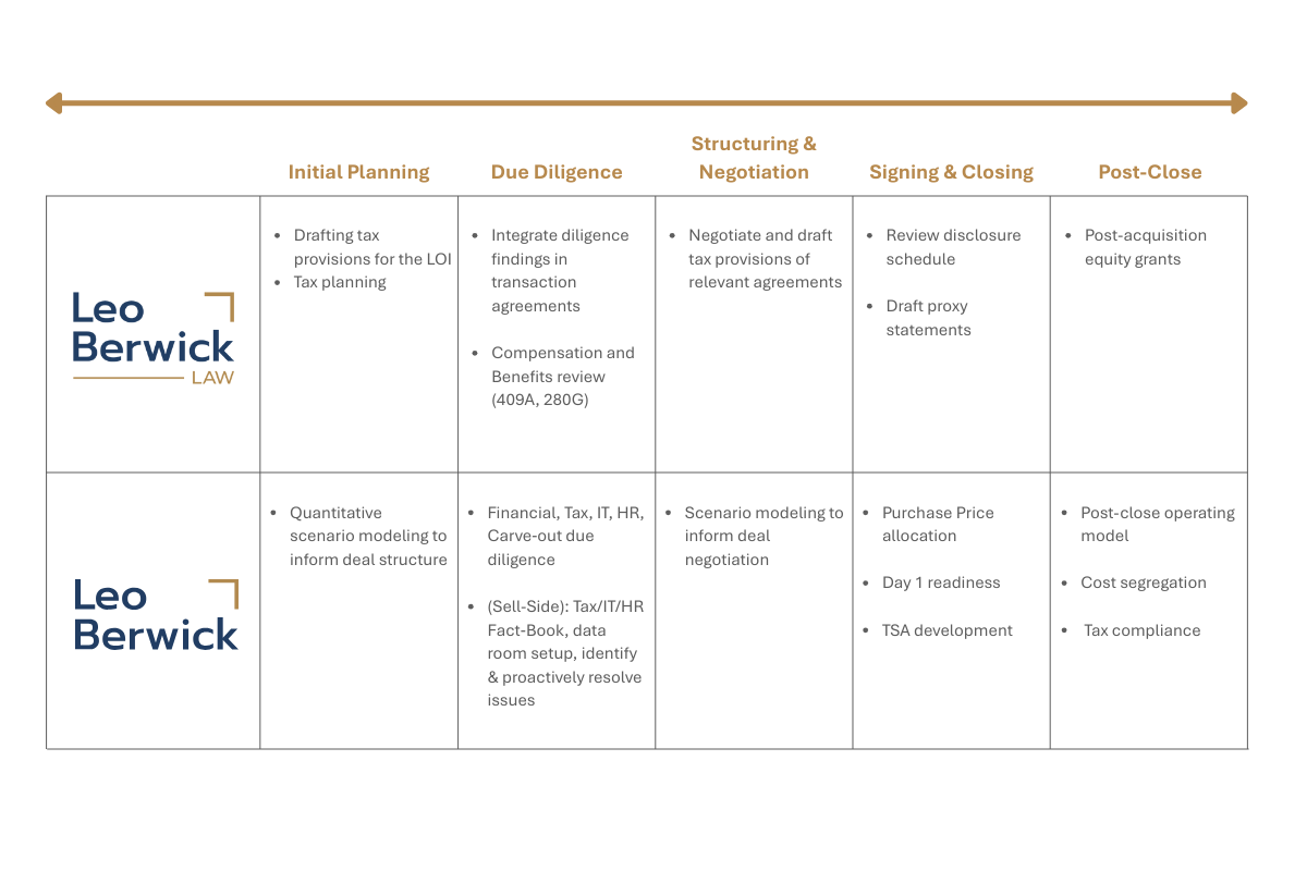At Leo Berwick Law, we deliver a comprehensive suite of tax and transaction-focused advisory services designed to help clients navigate complexity, mitigate risk, and accelerate value creation. Our integrated team of attorneys and specialized tax and financial professionals provide practical, commercially grounded guidance across the full deal lifecycle, from initial diligence and structuring through execution and post-closing implementation.